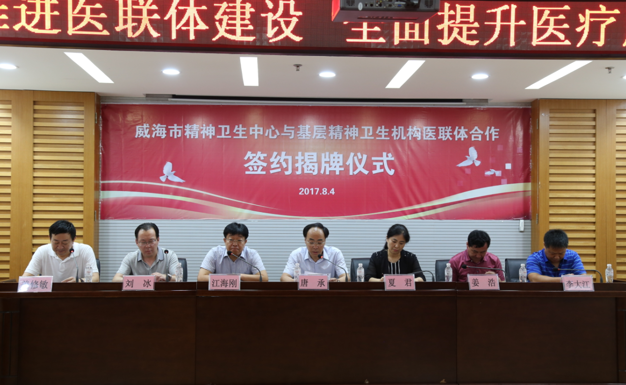 揭牌仪式由市精神卫生中心姜修敏副院长主持,市精神卫生中心院长唐承致辞,荣成市康宁医院刘冰院长代表四家合作医院致辞、市卫计委医政科科长夏君作重要讲话并预祝仪式取得圆满成功。